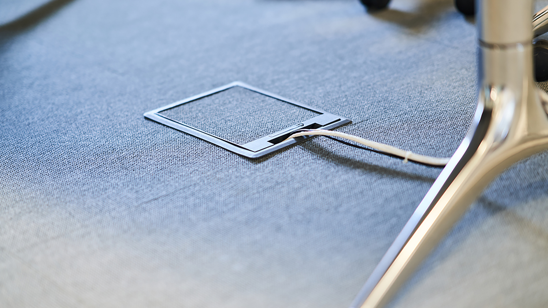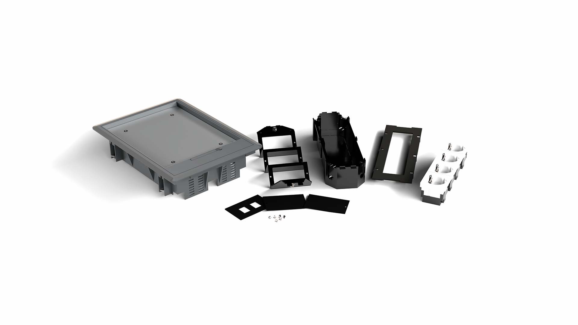Equipped floor box made of polyamide plastic, designed to be installed either directly into the floor or in a casting box. The floor box has a built-in size of 261x186 mm. It is equipped with the following components: an equipment box with accompanying 4-way power outlet and a mounting frame for low voltage with space for three mounting plates. Of these, two plates are blank, while the third has a hole pattern to accommodate two keystone connectors.