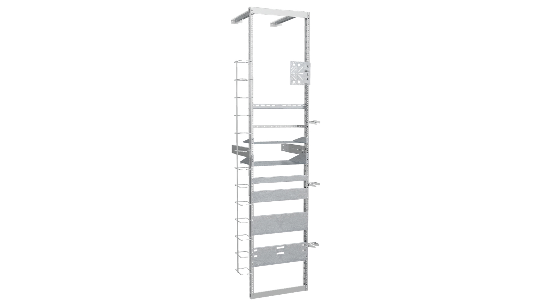 Floor rack with adjustable wall spacer 350 -600 mm - electro galvanized. MP-19" rack is a mounting kit that has two standards in the same rack data on one side, according to SS-EN 60297-3-100 with holes for cage nuts M6. Telecom on the other side, according to g:a SEN R 430115, with holes 6.5x31.75 mm for M6 screws. The height is 50 Units (44,45 mm) of which 48 are usable.
