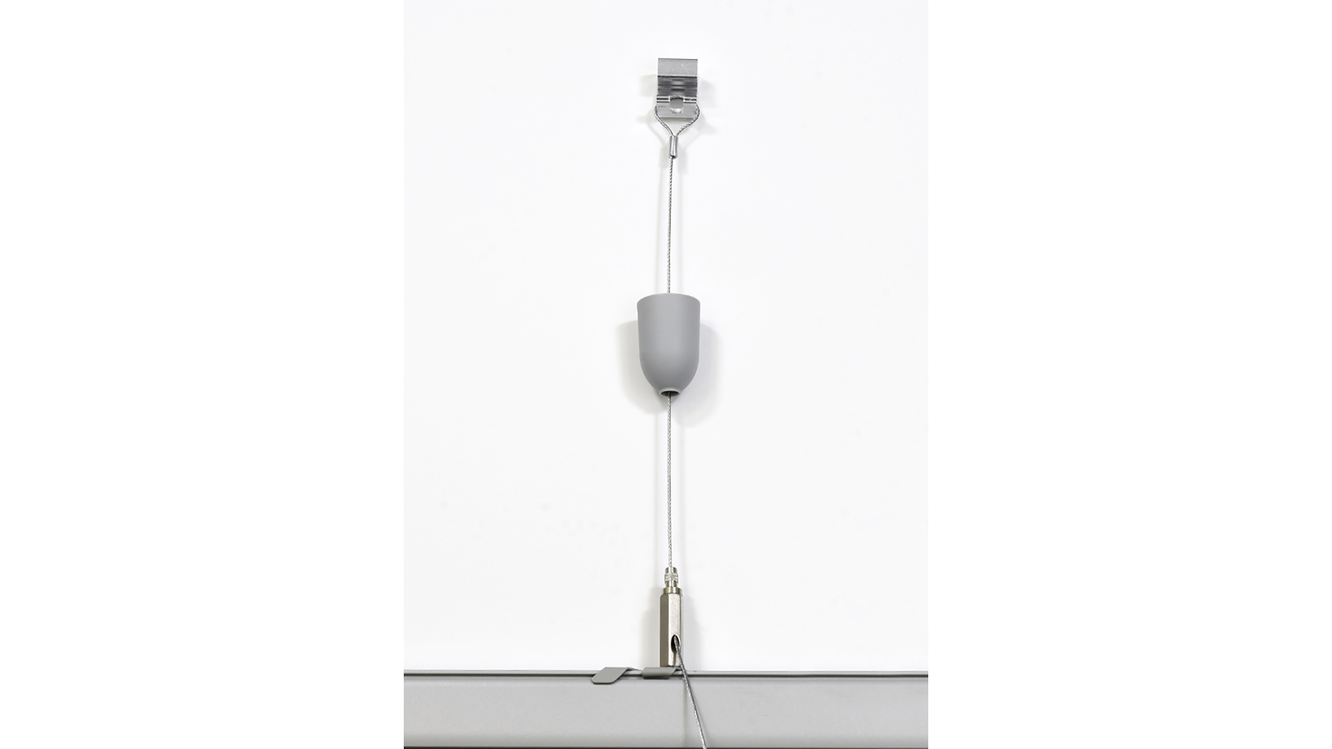 Upphängningsset med fäste för skena - grå (RAL 7040) Ett set innehåller fäste för skena, wire, takfäste och täckkåpa. Wirelängd: 5 m. Max belastning 150 N.